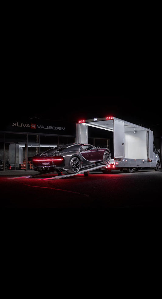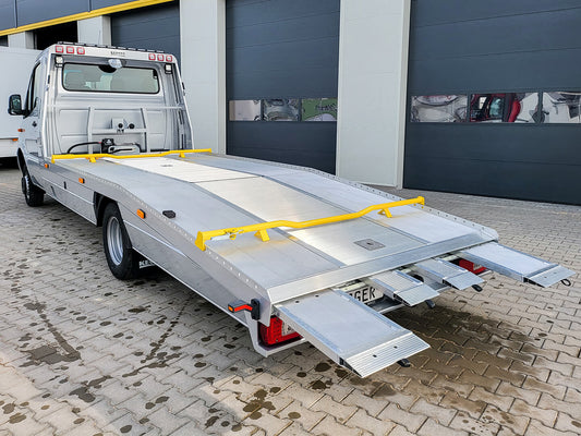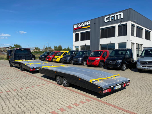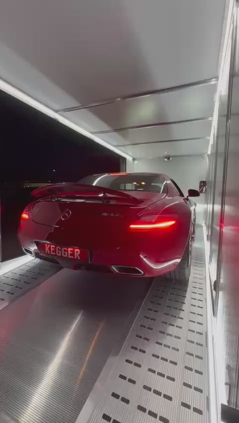 Kegger Transporters use a unique bed design that is simple and easy to use without the worries of low clearance vehicle approach, nor the hassle and complexity of a commercially sized tow truck. By using air hydraulics, the bed of the transporter lowers down significantly, as opposed to tilting back like a traditional American tow truck. Vehicles can then be loaded and unloaded on the extended ramp, providing a clear approach for even the lowest clearance vehicles. Exotic super cars can be loaded without fear of damaging the delicate underside of the vehicle. Use the winch or drive the vehicle up onto the tracks and clip the bar in place to secure its positioning. Tool boxes and other storage compartments down the length of the bed also provide the ability to take the workshop anywhere that might need it.