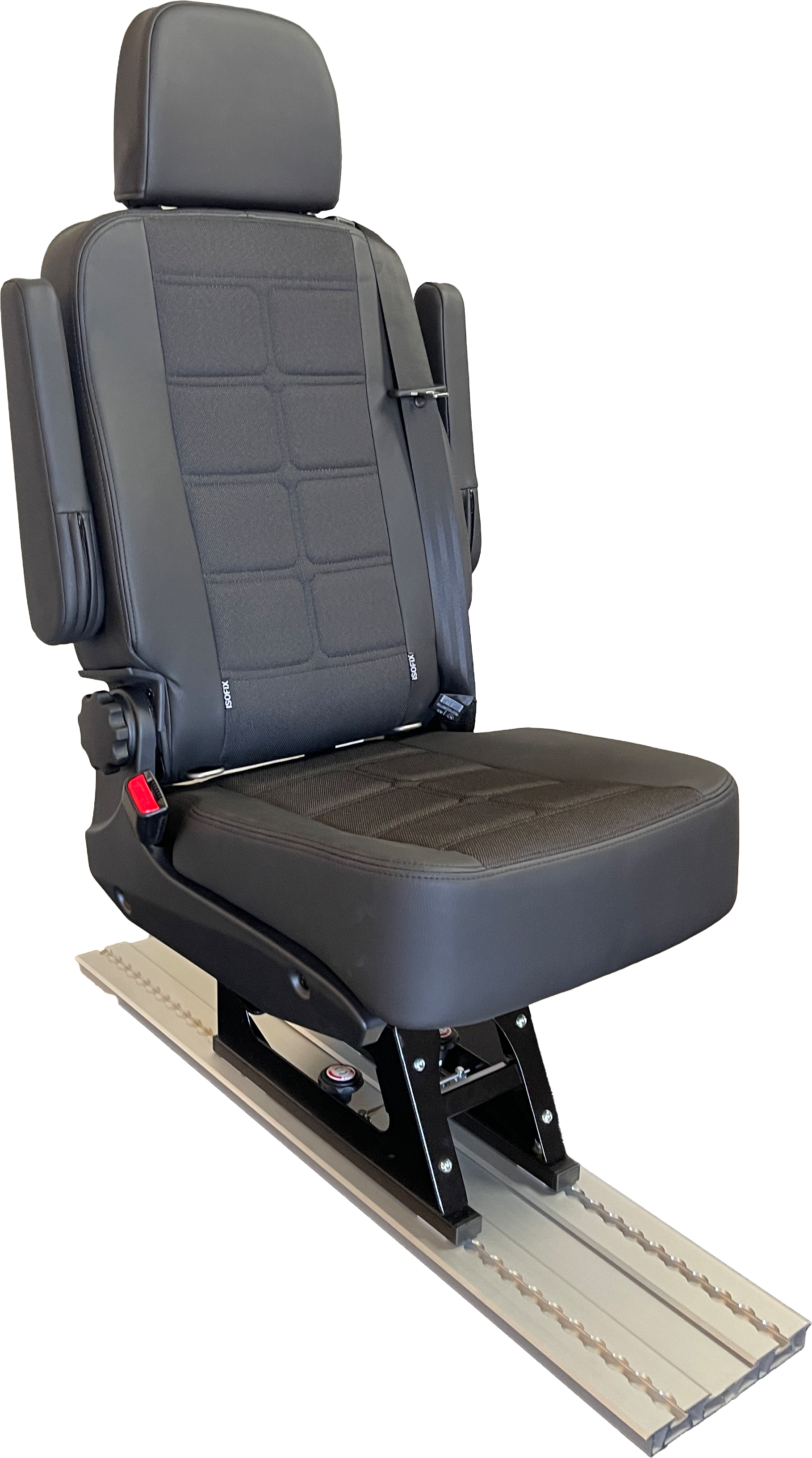 All-aluminum one piece L-Track mounting bracket for single seats like the Comfort, Adventure, or Taxi. Our unique seat brackets are safety certified in US, Canada, and Europe. Bracket offers slide in channel in middle for matching floor covering.